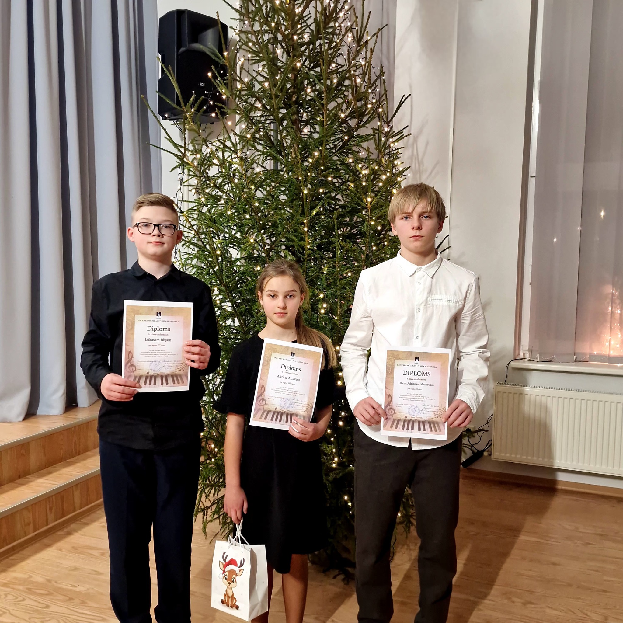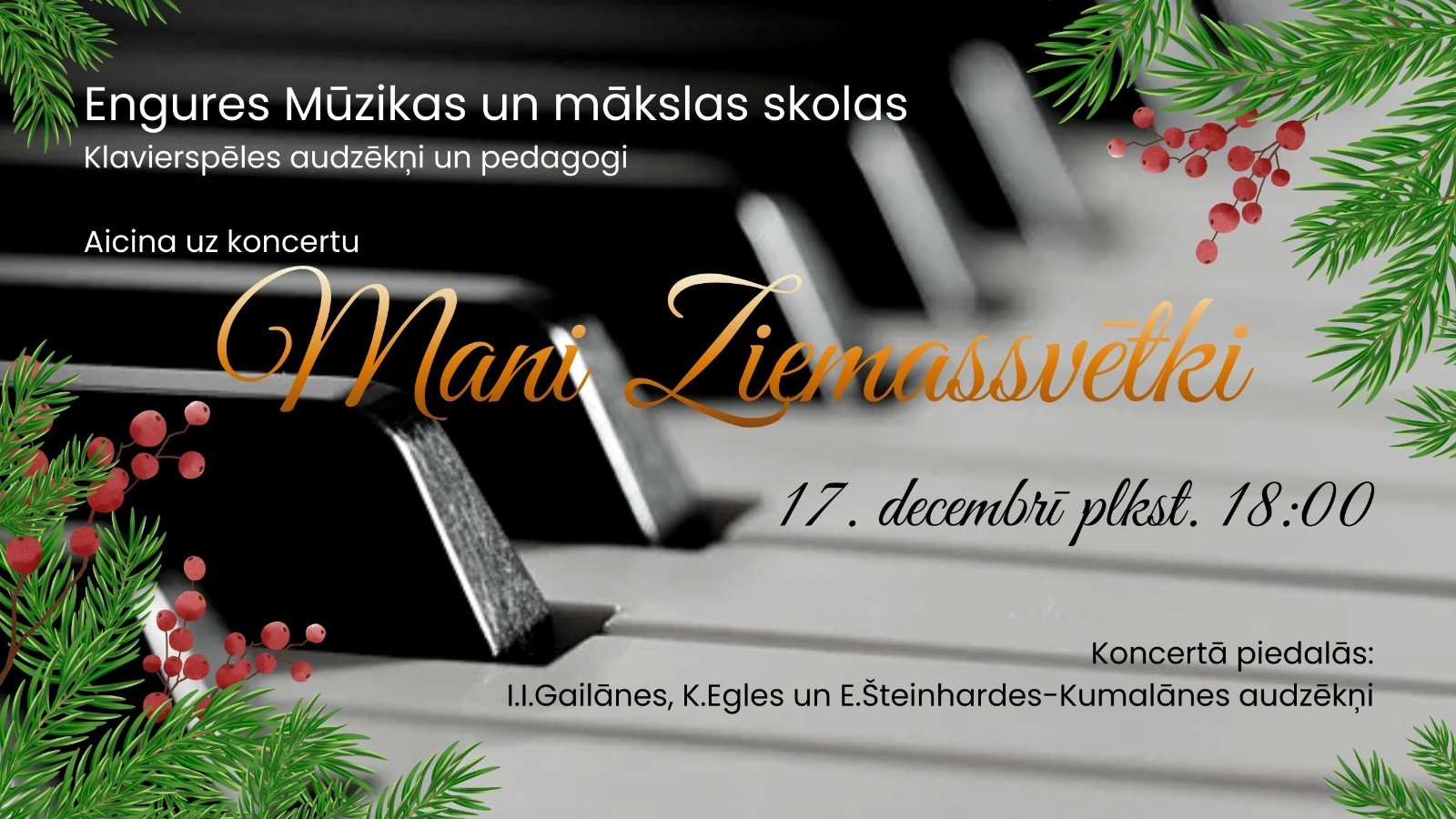 Engures Mūzikas un mākslas skolas klavierspēles pedagogi un audzēkņi vēlējās šo prieku dāvāt mīļajiem vecākiem, uzaicinot viņus uz koncertu. Savu spēlēt prasmi demonstrēja ne tikai pieredzējuši audzēkņi, bet arī paši mazākie – sagatavošanas un pirmās klases pianisti. Jautru gaisotni nodrošināja muzikālais rūķis, kurš koncerta beigās visiem dalīja dāvanas. Tā kā šogad ir Valsts konkurss klavierspēlē, koncerta izskaņā konkursa laureāti saņēma diplomus. Par labu sniegumu tika sveikta Adrija Andreca (4.kl.) , Lūkass Blija (6.kl.) un Dāvis Adrains Markovs (8.kl.).