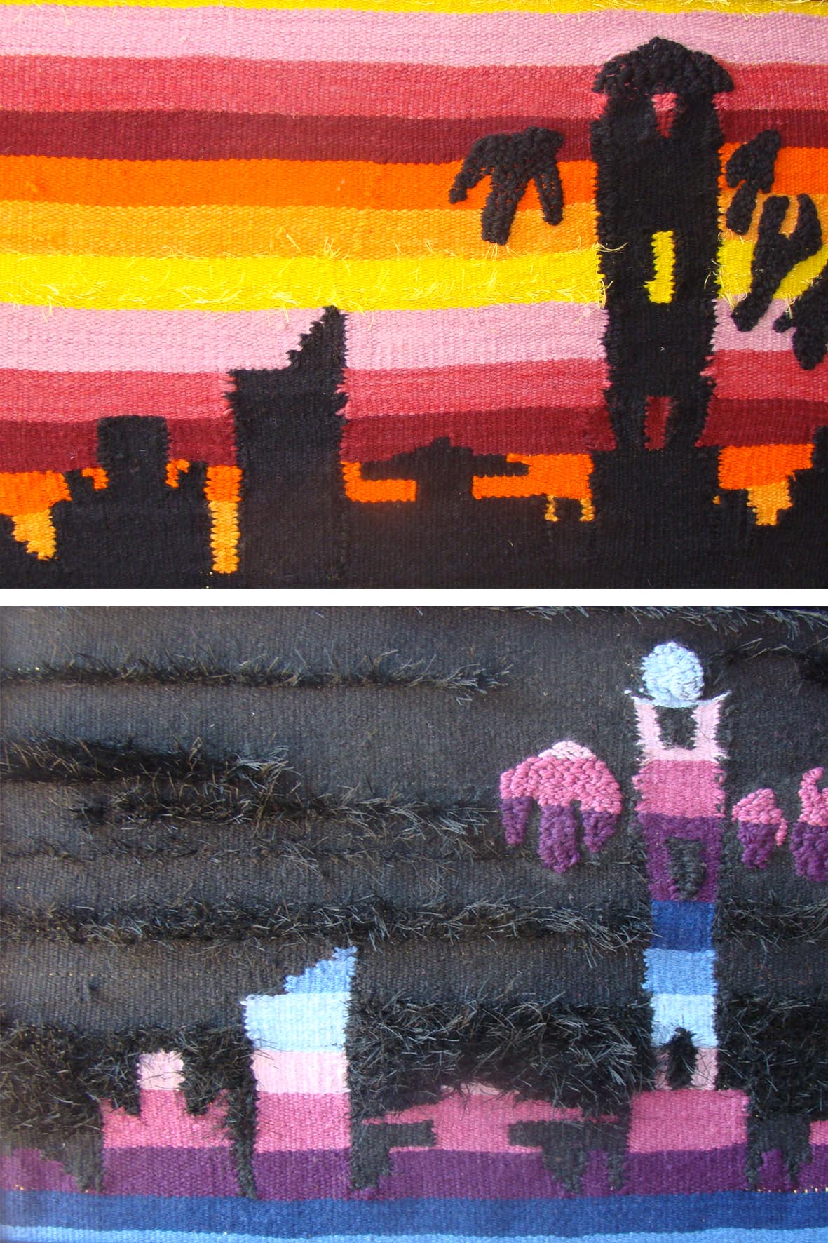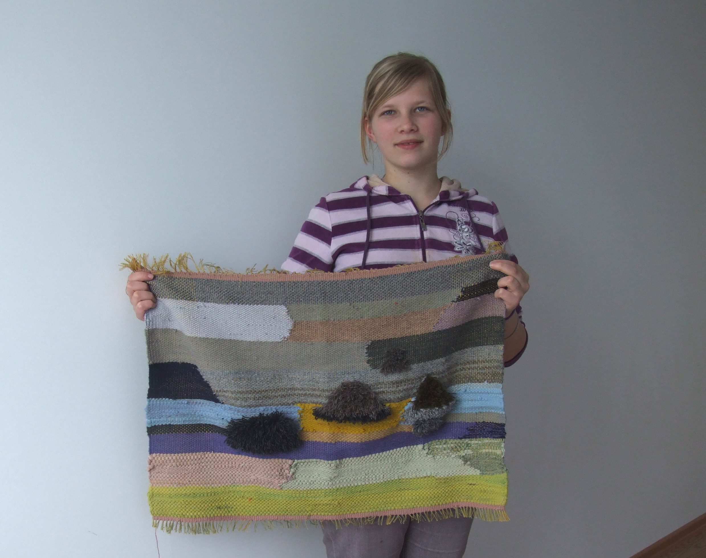Apgūstam pirmās iemaņas aušanā stellēs. Aužam vienkārtņa tehnikā gobelēnus, lupatu deķīšus un citus darbus. Mācamies vienas tekstila kompozīcijas darbu izaust speciālā rāmī.