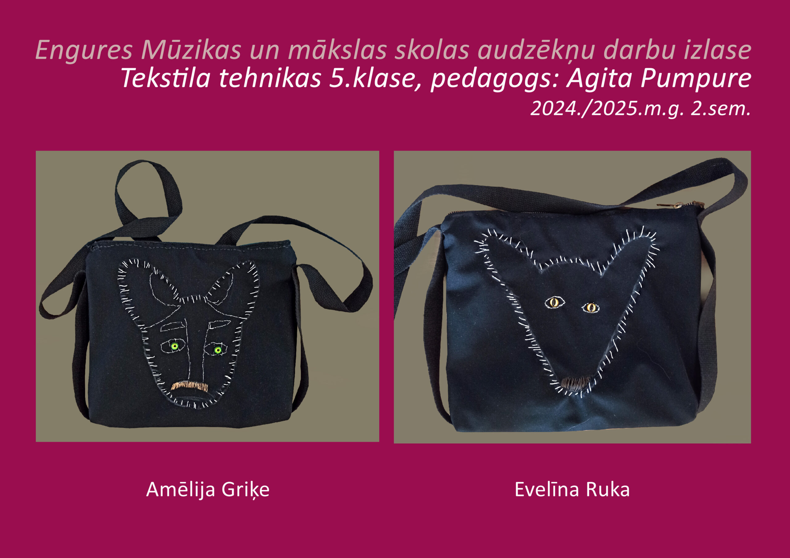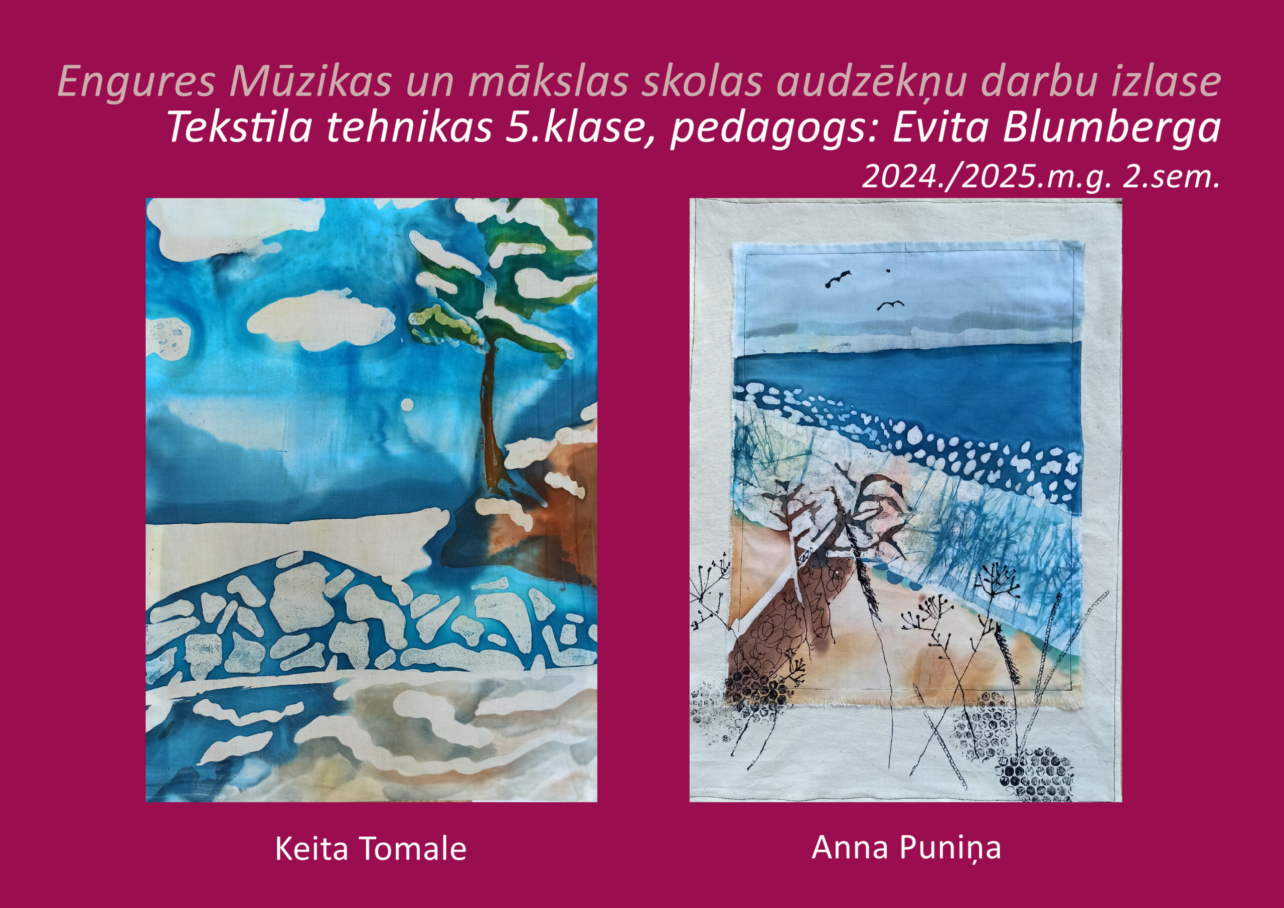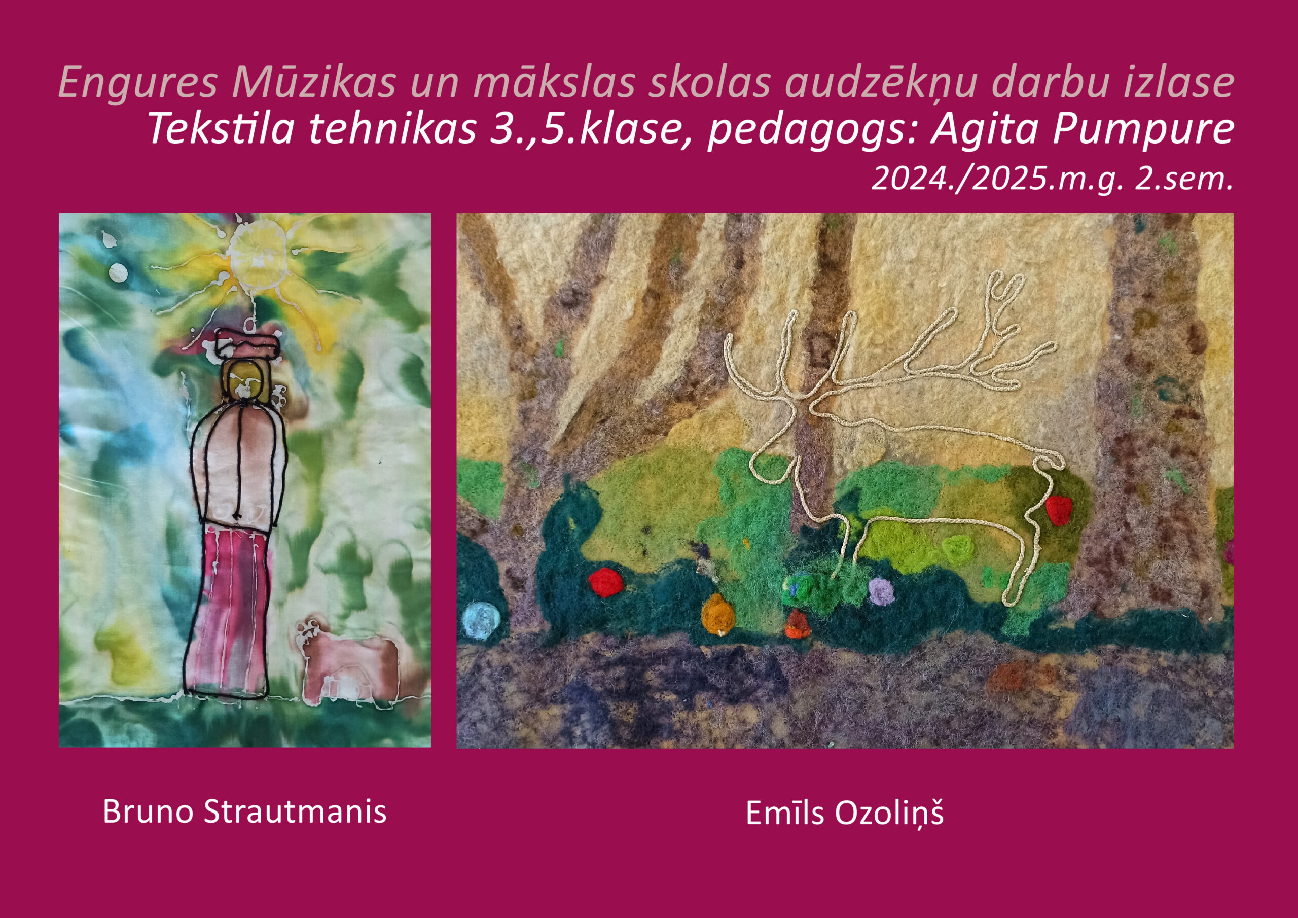 Bērna rociņa jau no pirmās klases tiek iemēģināta vienkāršās tekstila kompozīcijās un laika gaitā prasmes attīstās lielāka apjoma un sarežģītāka uzdevuma tekstila darbos.