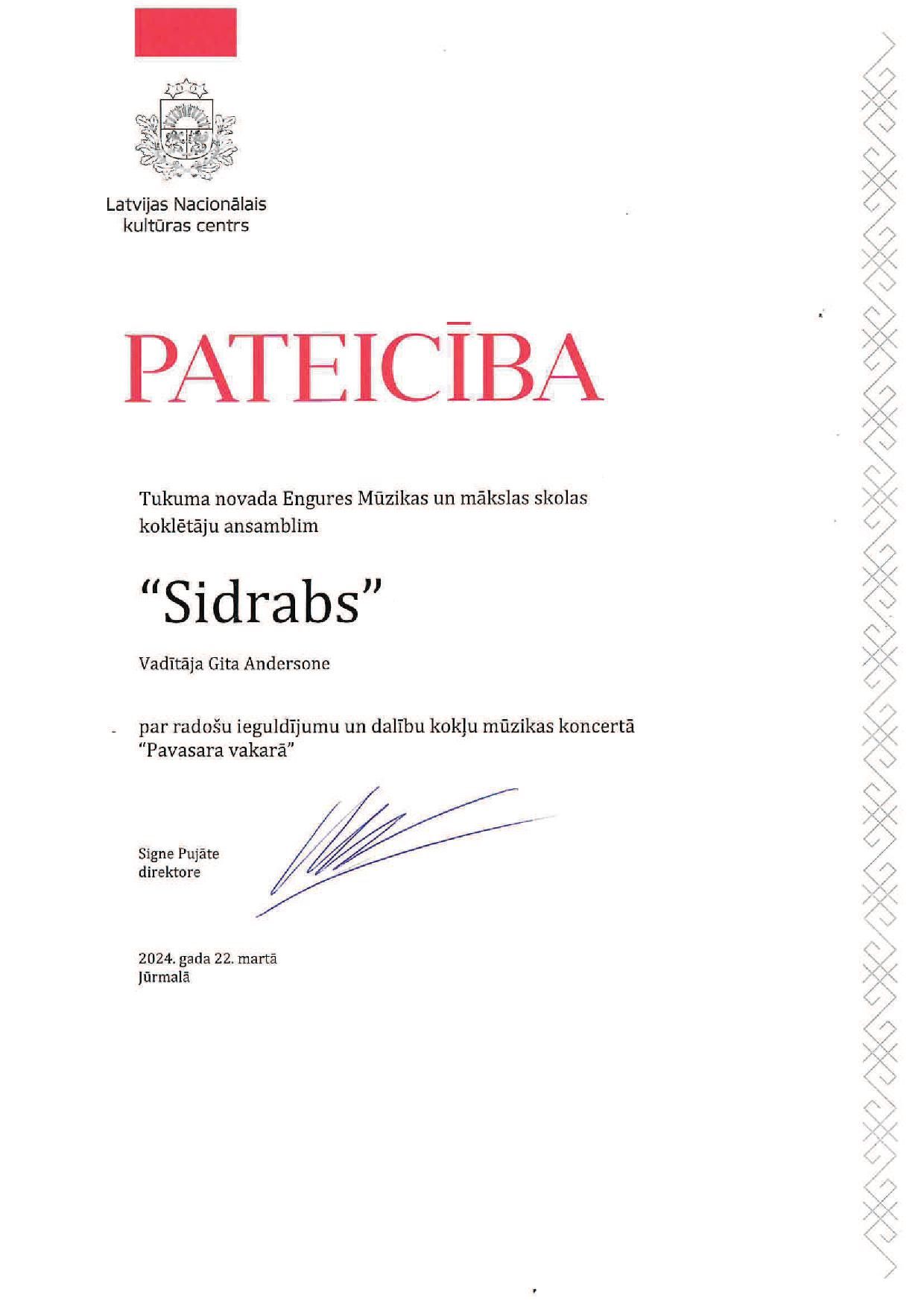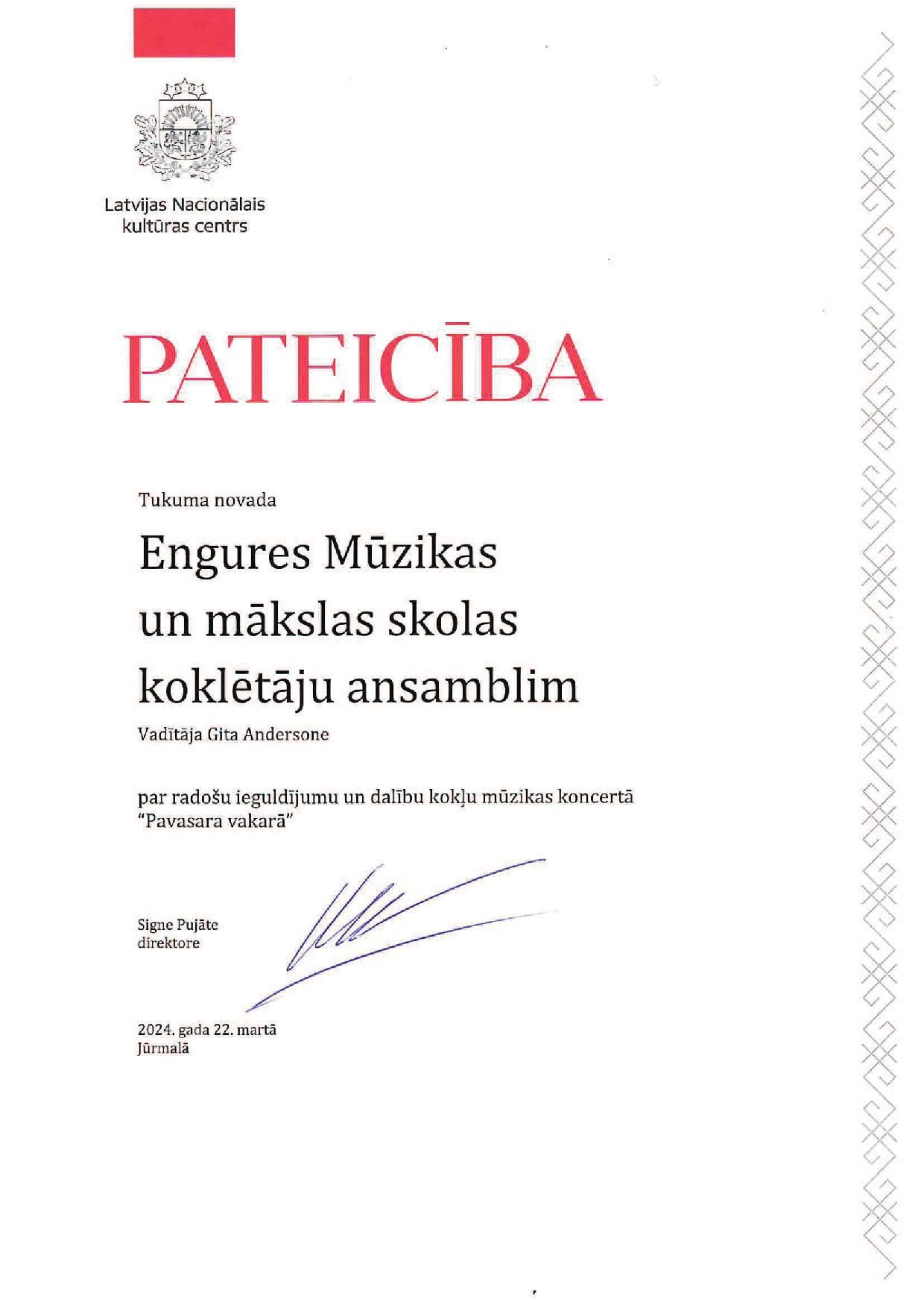 Koncerta noslēgumā Latvijas Nacionālā kultūras centra pārstāvis pasniedza skolu vadītājiem, diriģentiem, solistiem Latvijas Nacionālā kultūras centra Pateicības par lieliskā koncerta organizēšanu un īstenošanu.